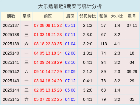 大小比分析:上期大小比为3:2,其中大数开出较多,近9期的奖号中少量推崇较强开出23枚,大数推崇较弱开出22枚;本期专属展望大小比为3:2。