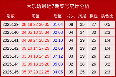 上期大乐透的开奖号码中,首尾组合为05+25,跨度为20,质合比为2:3。